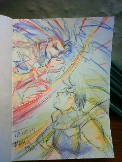 インテ終了後、塚元、前科さん、ひかげさん、ハタさんの四人でカラオケ行ってそのまままんだらけに流れこんで、ノートに前科さんと合作してきました。スタンド使いの方はぜひ惹かれ合ってくだしあ。